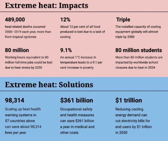 2000~2019년까지 폭염으로 매년 48만9000명이 사망했다. 이는 열대성 사이클론보다 더 큰 규모이다. 전 세계 식량 생산의 12%가 폭염으로 감소했다. 8000만명의 학생들이 2024년 폭염으로 학교에 가지 못하는 상황이 발생했다. 폭염의 ‘도미노 효과’가 사회 곳곳에 영향을 미치고 있다.