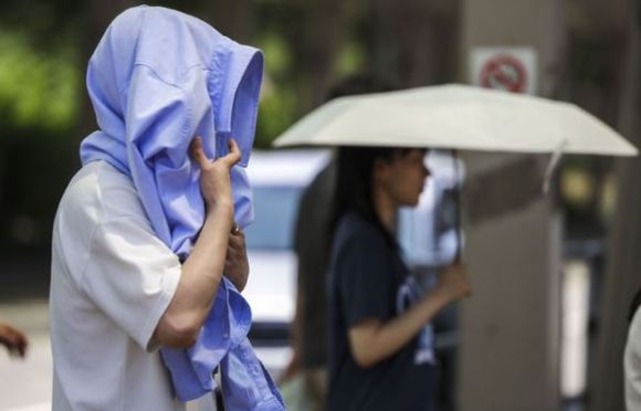 서울 영등포구 여의도환승센터에서 한 시민이 옷으로 햇빛을 가린 채 이동하고 있다. [사진=뉴시스]