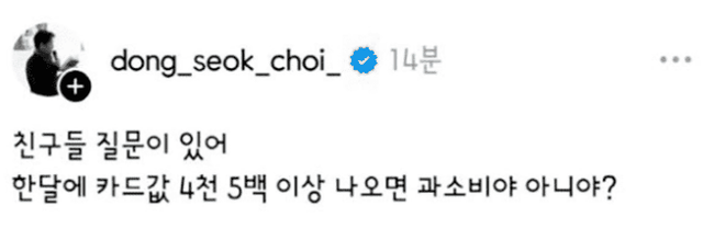 2024년 6월 25일 최동석은 자신의 SNS에 “친구들 질문이 있어."라며 "한 달에 카드값 4천5백 이상 나오면 과소비야, 아니야?”라는 글을 올려 많은 이들의 이목을 끌었습니다.