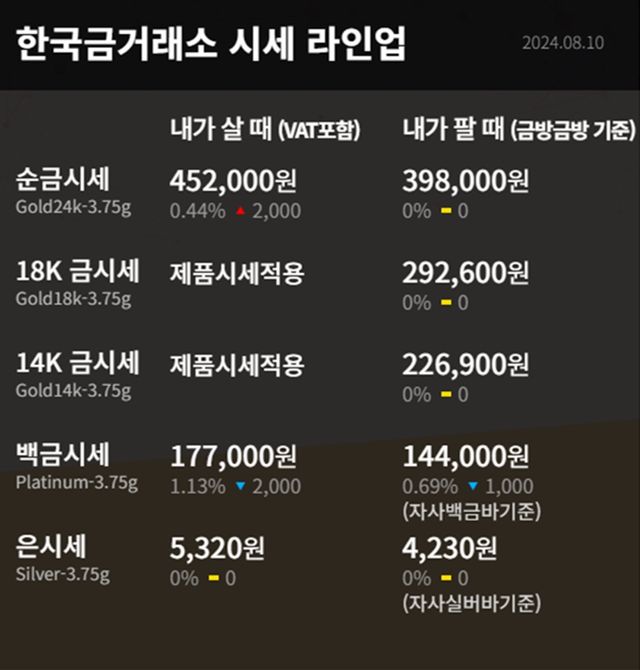 순금(24K) : 매입가 45만 2000원 / 매도가 39만 8000원