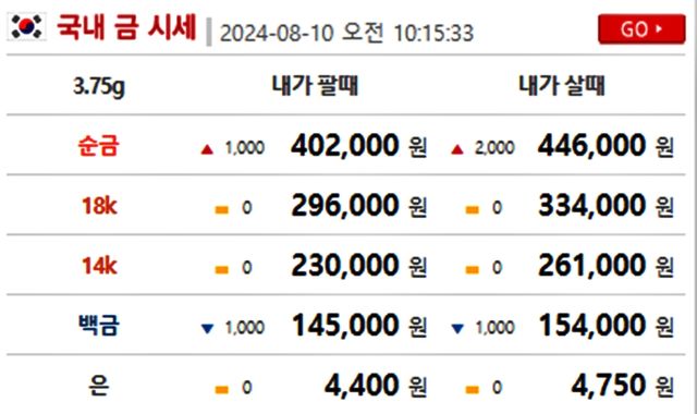 순금(24K) : 매입가 44만 6000원 / 매도가 40만 2000원