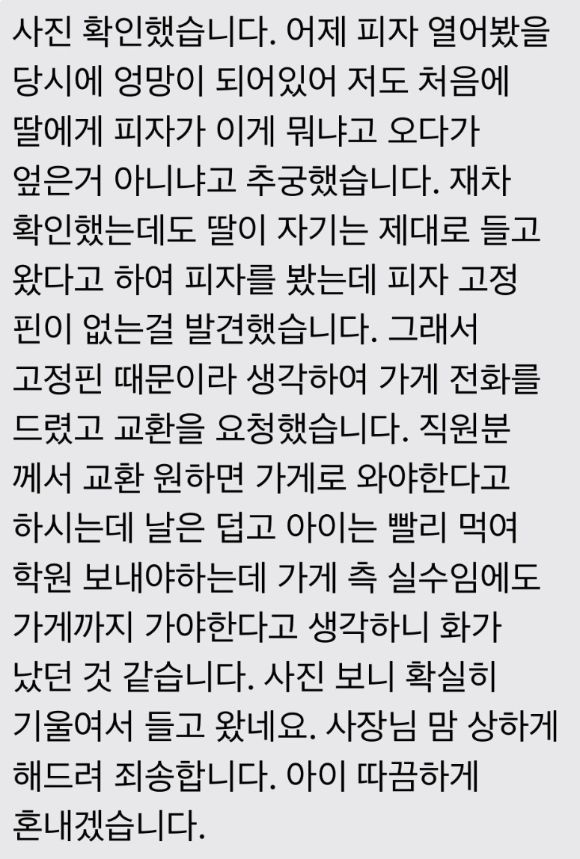 A씨가 공개한 문자메시지에서 B씨 엄마는 "피자가 쏠려서 배달되자 딸(B씨)에게 피자를 엎은 거 아니냐고 추궁했다. 그래서 가게에 전화해 교환을 요청한 것"이라며 "사진을 보니 확실히 기울여서 들고 왔다. 사장님께 죄송하다"고 사과했다.