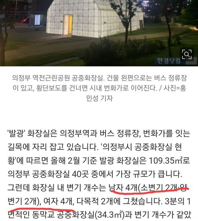 참고로 공중화장실법에는 여자화장실 대변기수보다 남자화장실의 소변기+대변기 합이 클 수 없다는 등신같은 내용이 놀랍게도 실존해서 공간이 남아도 못만듬ㅋ