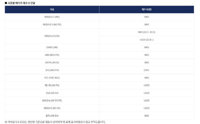 11일 업계에 따르면 현대차 홈페이지를 통해 현대차 10종 및 제네시스 3종 등 총 13종의 전기차에 탑재한 배터리 제조사 정보를 확인할 수 있다.