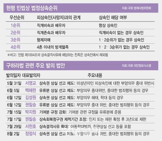 구하라법이 국회를 통과해 시행되면 부양의무를 이행하지 않은 부모의 상속권은 제한되는 한편 피상속인을 특별히 부양하거나 재산 증식에 기여한 상속인의 권리는 더욱 보호받게 될 전망이다.