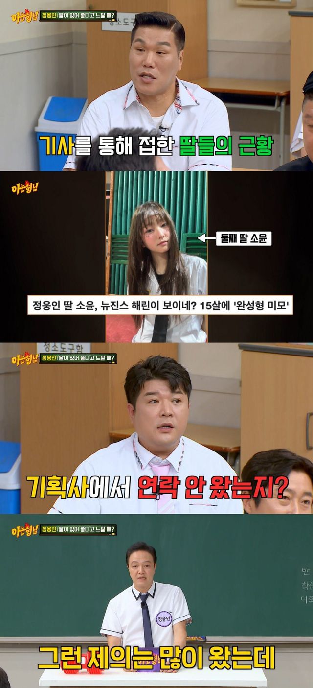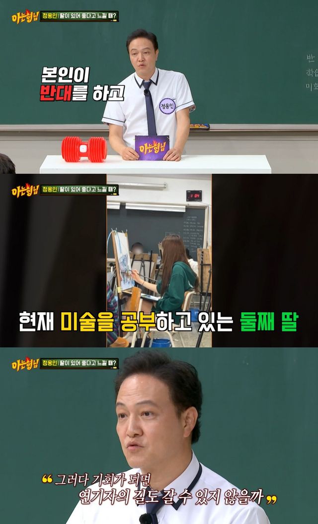 이에 신동이 "딸 소윤이는 기획사 제안을 받지 않았느냐"라고 묻자, 정웅인은 "그런 제의는 많이 왔는데 일단 본인이 반대한다. 딸이 미술을 하는데 미대에 가서 하고 싶은 거 하려고 한다"고 답했다.