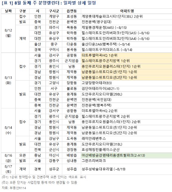 부동산R114에 따르면 서울 강서구 공항동 '더트루엘마곡HQ', 경기 광주시 곤지암읍 ‘힐스테이트광주곤지암역’, 경기 용인시 남동 ‘용인푸르지오원클러스터’ 등이 8월 2주 청약을 진행한다. 견본주택은 충남 아산시 배방읍 '아산배방금강펜테리움센트럴파크' 등 1곳이 개관 예정이다.