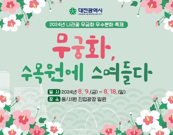 대전시는제79주년광복절을기념하기위한‘2024년나라꽃무궁화우수분화축제’를9일부터18일까지한밭수목원동·서원진입광장일원에서개최한다.