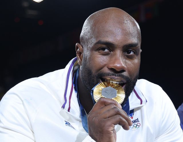 금메달 들고 포즈 취하는 리네르 (파리=연합뉴스) 김도훈 기자 = 2일(현지시간) 프랑스 파리 아레나 샹드마르스에서 열린 2024 파리올림픽 유도 남자 100kg 이상급 시상식에서 금메달을 획득한 테디 리네르가 메달을 들고 포즈를 취하고 있다.