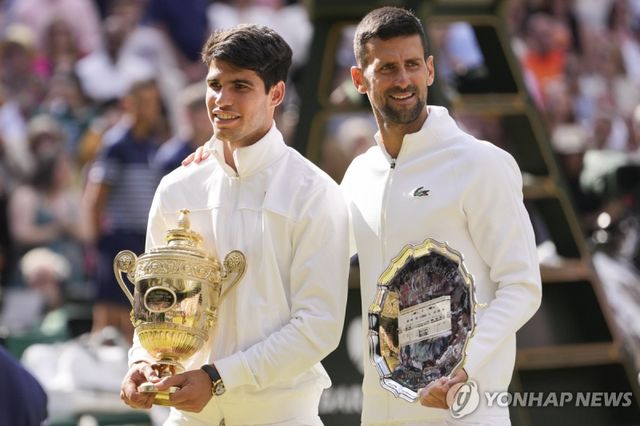 시상식에 나란히 선 알카라스(왼쪽)와 조코비치_[AP=연합뉴스]