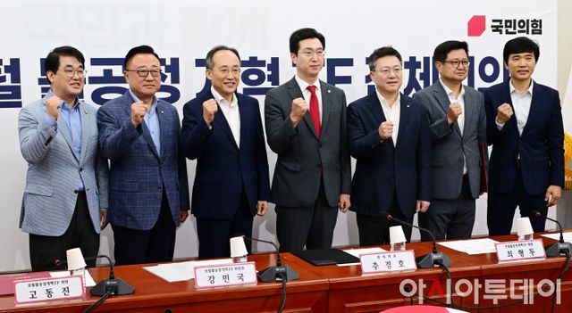 아시아투데이 이병화 기자 = 추경호 국민의힘 원내대표가 12일 국회에서 열린 ‘포털 불공정 개혁 TF’ 임명장 수여식 및 1차 회의에 참석해 강민국 위원장을 비롯한 위원들과 기념촬영을 하고 있다. 왼쪽부터 배준영 원내수석부대표, 고동진 위원, 추 원내대표, 강민국 위원장, 박정하 위원, 김장겸 위원, 김시관 위원.