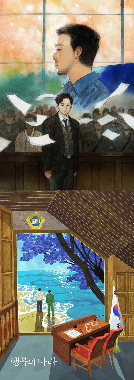 이번 '행복의 나라' 콜라보레이션 일러스트는 영화가 담고 있는 먹먹한 감동과 묵직한 메시지를 표현함과 동시에 상관의 지시로 10.26 대통령 암살사건에 연루되어 재판을 받게 된 중앙정보부장 수행비서관 박태주(이선균 분)와 그를 변호하는 개싸움 일인자 변호사 정인후(조정석)에 대한 각 작가의 다채로운 해석을 엿볼 수 있어 눈길을 끈다.