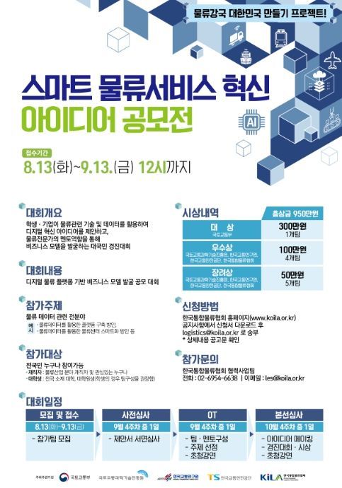 물류 분야에 참신하고 혁신적인 아이디어를 발굴하기 위해 물류데이터 관련 모든 분야에 대해 아이디어를 제안할 수 있으며, 공모 접수기간은 8월 13일부터 9월 13일까지로 물류에 관심 있는 국민 누구나 공모에 참여할 수 있다.