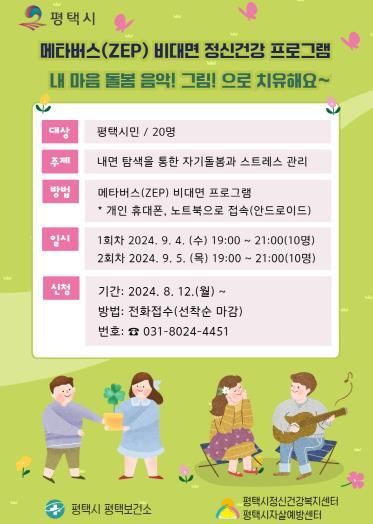 [와이뉴스] 평택시 정신건강복지센터에서는 바쁜 일상 속 ‘쉼’이 필요한 시민들을 대상으로 비대면 메타버스 정신건강 프로그램인 "나를 위한 뮤직케어"를 실시한다.