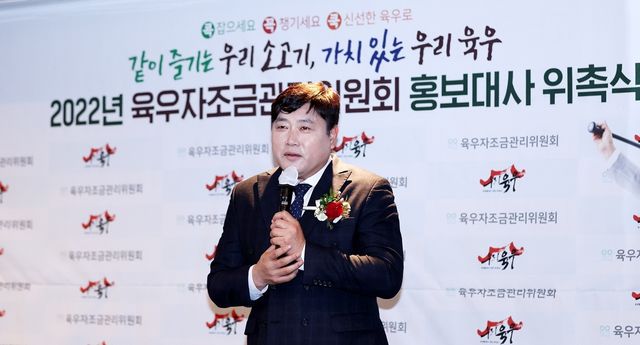 2022년 1월 25일 서울 서초구 양재 엘타워에서 열린 2022 육우자조금 홍보대사 위촉식 행사에서 홍보대사로 위촉된 전 야구선수 양준혁이 인사말을 하고 있다. / 뉴스1