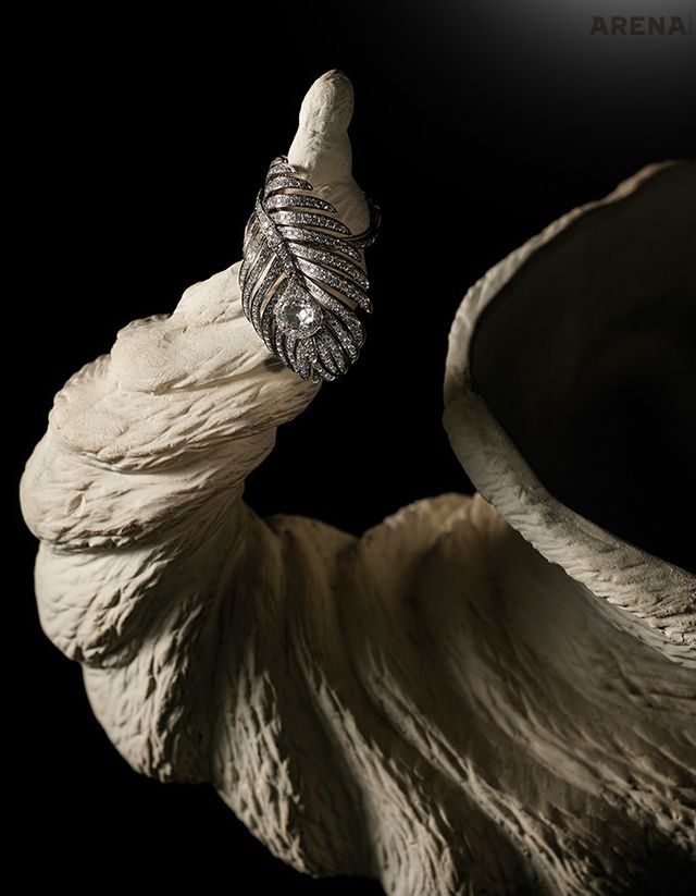 공작새의 가벼운 깃털을 섬세하게 표현한 화이트 골드 소재의 플륌 드 펑 라지 링 6000만원대 부쉐론 제품. 거친 질감이 느껴지는 뿔 모양 도자기 21만원 39etc 제품.