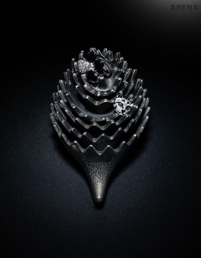 다이아몬드와 오닉스로 완성한 18K 화이트 골드 소재의 코스모스 링 가격미정 반클리프 아펠, 18K 화이트 골드소 재에 화이트 라운드 다이아몬드 232개와 마르퀴즈 카보숑 그린 에메랄드 4개를 세팅한 퍼지 레오파드 캣 화이트 골드 스터드 이어링 3천만원대 부쉐론 제품 고. 슴도치 모티브의 트레이 31만원 39etc 제품.