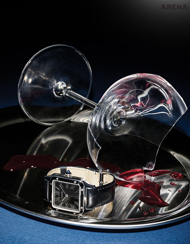 블랙 래커 마감한 스퀘어 케이스와 검 모양의 스틸 핸즈가 돋보이는 산토스-뒤몽 워치 800만원대 까르띠에 제품.
