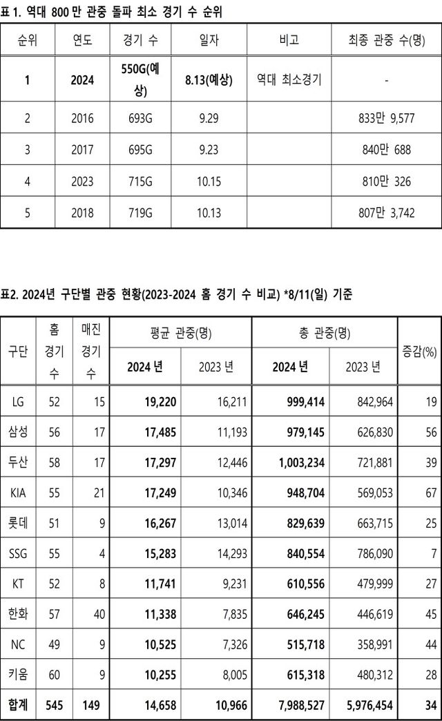 2024 KBO 리그는 11일 경기까지 545경기 누적 관중 798만8527명을 기록 중이다. 800만 관중 달성까지 1만1473명을 남겨두고 있다. 이변이 없는 한 13일 800만 관중 고지에 올라설 전망이다.