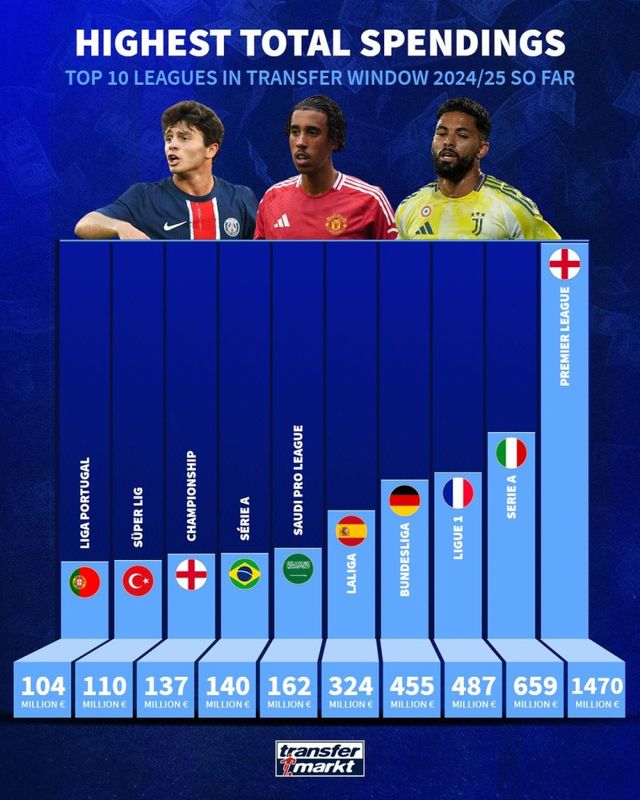 유럽 축구 통계 매체 트랜스퍼마르크트는 13일(한국시간) 2024~25시즌 여름 이적시장 동안 이적료를 가장 많이 지출한 리그 톱10을 집계해 발표했다.
