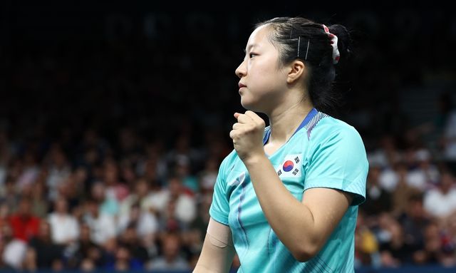 지난달 31일(현지 시각) 프랑스 파리 사우스파리 아레나에서 열린 2024 파리올림픽 탁구 여자 단식 32강전에서 한국 신유빈이 헝가리 게오르기나 포타를 상대로 득점한 뒤 기뻐하고 있다. / 연합뉴스