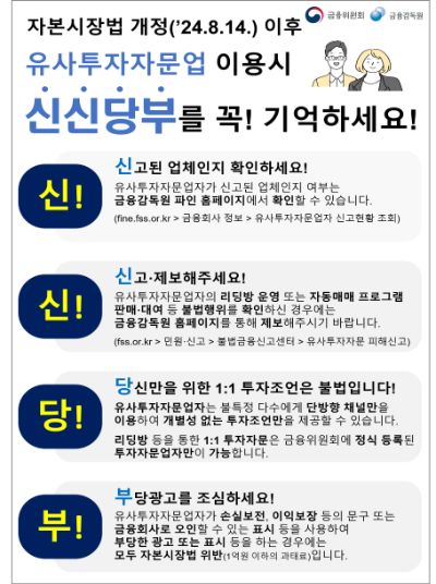 금융위원회는 이번 개정을 통해 유사투자자문업자가 오픈채팅방 등 온라인 양방향 채널을 이용하거나, 손실보전·이익보장 등의 문구 등을 사용하는 행위가 금지되는 등 불건전영업에 대한 투자자 보호가 강화될 것으로 기대했다.