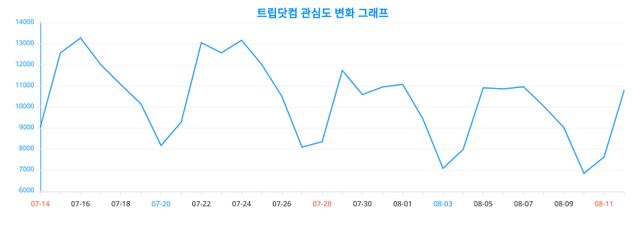 트립닷컴에 대한 트렌드지수 그래프에서 현재 10,812포인트로, 전일 7,634포인트보다 상승하며 변화를 보였다.