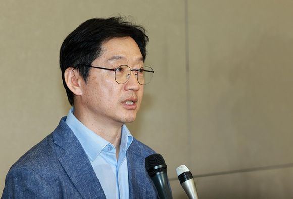 영국에서 체류 중인 김경수 전 경남도지사가 지난달 19일 오후 인천국제공항 제2여객터미널을 통해 귀국해 취재진 질문에 답변하고 있다. 김 전 지사는 오는 23일 경남 김해 봉하마을에서 열릴 고 노무현 전 대통령 서거 15주기 추도식 참석을 위해 국내로 잠시 돌아왔다. 2024.05.19. [사진=뉴시스]