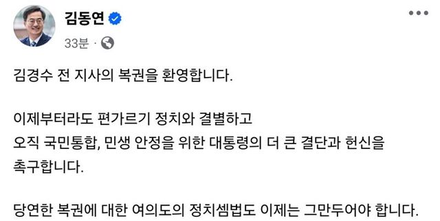 김동연 지사는 "김경수 전 지사의 복권을 환영한다"면서 "이제부터라도 편가르기 정치와 결별하고 오직 국민통합, 민생 안정을 위한 대통령의 더 큰 결단과 헌신을 촉구한다"고 주장했다.