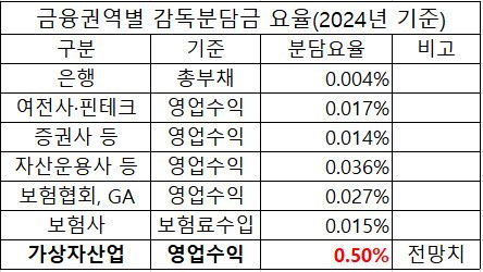 가상자산업계 관계자는 "내야 한다면 성실하게 납부할 계획이지만, 솔직히 부담은 있다"면서 "감독 나가는 횟수나 투입 인력 수는 영업수익과 무관할 수 있는데, 전체 분담금을 영업수익이 많은 곳에서 나눠서 내라는 건 합리적이지 못하다"고 꼬집었다.