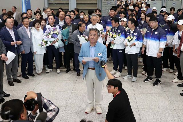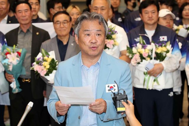 이기흥 대한체육회장이 파리 올림픽을 마치고 13일 인천국제공항을 통해 귀국해 발언하고 있다. / 뉴스1