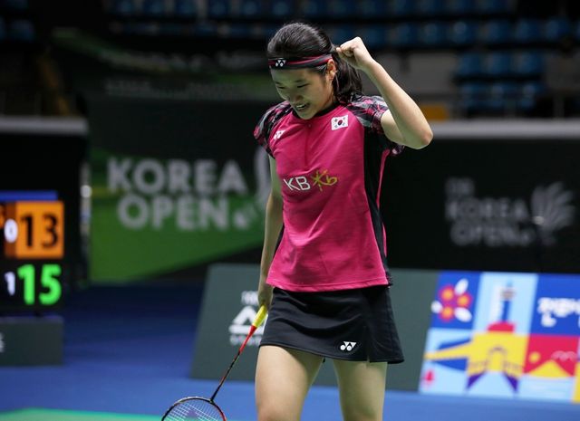 한국 안세영이 2022년 4월 10일 전남 순천 팔마체육관에서 열린 2022 코리아오픈 배드민턴선수권대회 여자 단식 결승전 태국의 포른파위 초추웡과의 경기에서 긴 공방 끝에 득점하며 기뻐하고 있다. / 연합뉴스