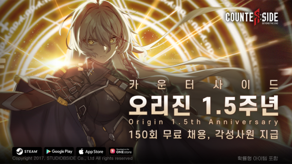 한편, ‘카운터사이드’는 1.5주년을 맞아 오퍼레이터 보조기술 토큰 기능, 전체 각성사원 복각 채용, 첫 충전 상품 구매 횟수 초기화, 라스트 스탠드 시즌 8, 기계수집가 사원 재무장 등의 다양한 업데이트를 통해 더욱 더 개선된 게임 환경을 제공하고 카운터사이드를 방문하는 모든 유저들을 맞이할 계획이다.