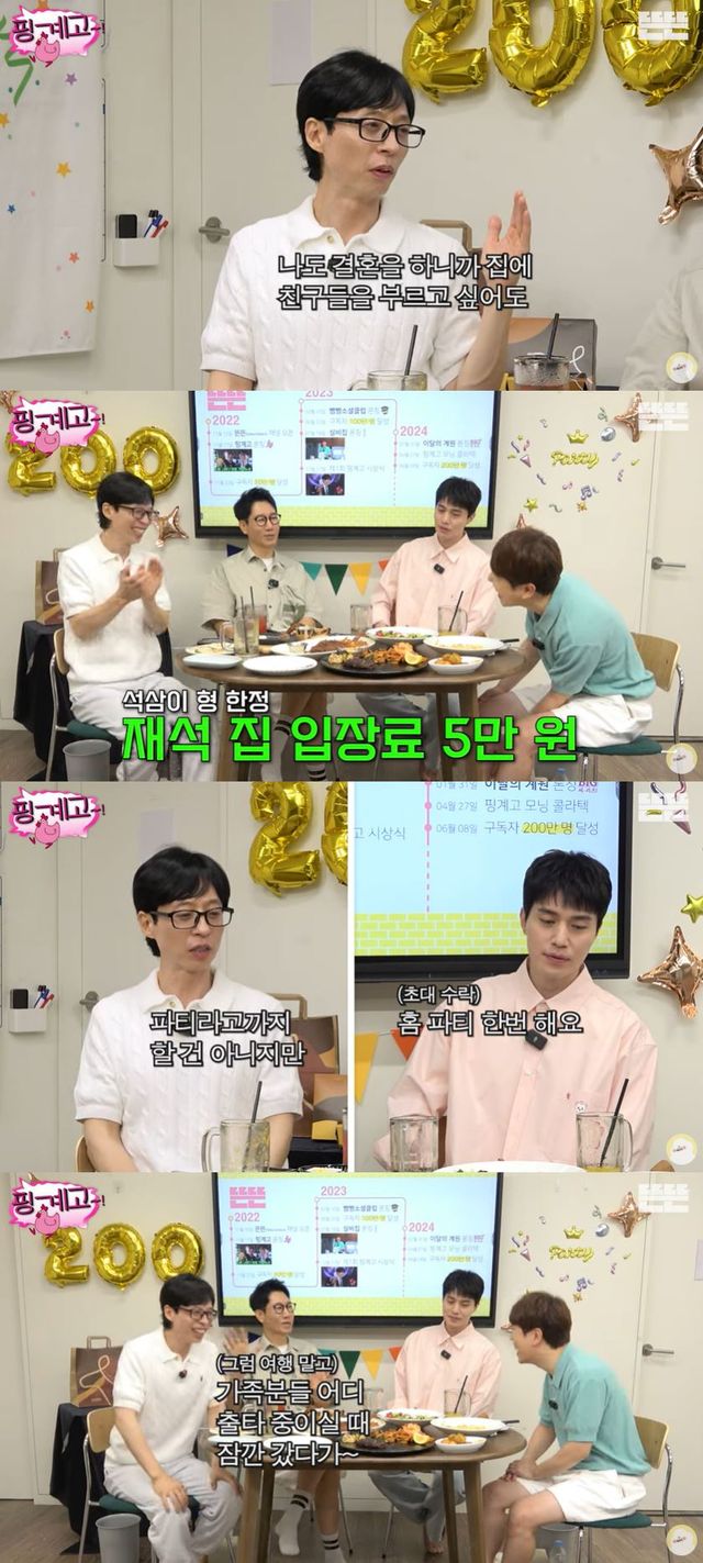 지난해 새로운 집으로 이사한 유재석은 지난 6월 SBS '런닝맨'에서 집들이를 제안한 지석진에게 "참가비 5만 원씩"이라고 말한 바 있다. 지석진이 이를 언급한 것.