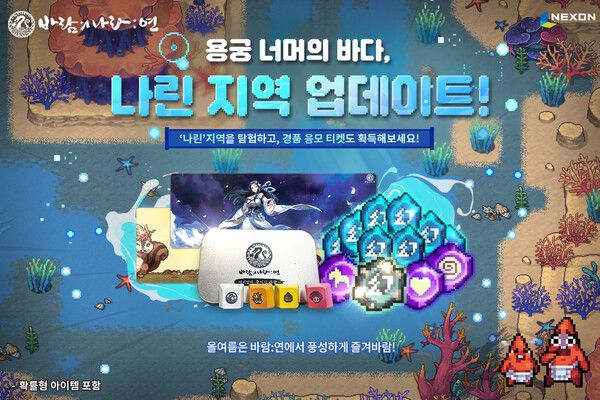 넥슨은 신규 지역 ‘나린’ 업데이트를 기념해 다양한 보상을 제공하는 이벤트를 진행한다. 먼저, 8월 29일까지 ‘괴도 토끼의 굿즈 대방출’ 웹 이벤트를 진행한다. 출석, 몬스터 처치 등 임무 완료 시 ‘보물 환수소환석’, ‘괴도 토끼가 흘리고 간 티켓’ 응모권 등 풍성한 보상을 획득할 수 있으며, 획득한 응모권으로 ‘바람의나라: 연’ 장패드, 서울랜드 자유 이용권 등 다양한 경품과 교환할 수 있다. 이와 함께, 9월 4일까지 매일 출석만해도 ‘빛을 바랜 보주’, ‘원시 바다의 영험한 기운’ 등 성장 지원 보상을 얻을 수 있다.