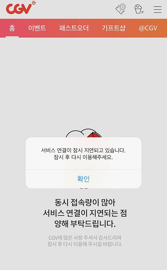 여기에는 이날 오전 10시 10분쯤 CGV 애플리케이션 화면을 캡처한 이미지가 담겨 있었다. 당시 화면에는 '서비스 연결이 잠시 지연되고 있습니다. 잠시 후 다시 이용해 주세요' '동시 접속량이 많아 서비스 연결이 지연되는 점 양해 부탁드립니다. CGV에 많은 사랑 주셔서 감사드리며 잠시 후 다시 이용해 주시길 바랍니다' 등의 접속 장애 안내 문구가 나왔다. 그야말로 이례적인 현상이다.