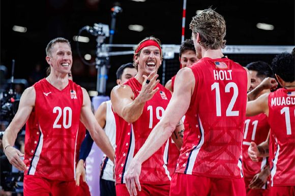 미국남자배구대표팀 미들 블로커 테일러 에버릴(19번)이 2024 파리올림픽 남자배구 이탈리아와 동메달 결정전에서 공격 성공 후 팀 동료들과 함께 기뻐하고 있다. 그는 몬자 소속으로 이우진과 함께 한국을 찾아 대한항공, V리그 올스타팀과 경기를 치를 예정이다. [사진=국제배구연맹(FIVB)]