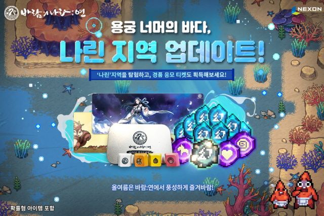 넥슨은 신규 지역 '나린' 업데이트를 기념해 8월 29일까지 '괴도 토끼의 굿즈 대방출'을 진행한다. 출석, 몬스터 처치 등 임무 완료 시 '보물 환수소환석', '괴도 토끼가 흘리고 간 티켓' 응모권 등 보상을 획득할 수 있으며, 획득한 응모권으로 '바람의나라: 연' 장패드, 서울랜드 자유 이용권 등 경품과 교환할 수 있다.