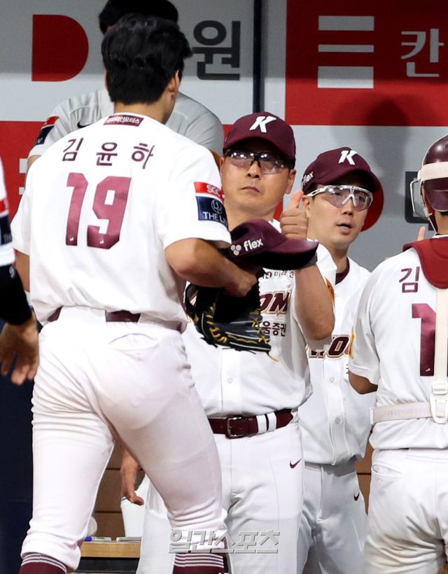 2024 KBO리그 프로야구 키움 히어로즈와 KIA 타이거즈의 경기가 13일 오후 서울 고척스카이돔에서 열렸다. 7회초 1사 만루 박찬호를 병살로 처리한 김윤하가 마운드를 내려가자 홍원기 감독이 엄지를 들어보이며 맞이하고 있다. 고척=김민규 기자 /2024.08.13/