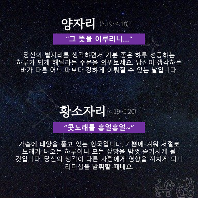 당신의 별자리를 생각하면서 기분 좋은 하루 성공하는 하루가 되게 해달라는 주문을 외워보세요. 당신이 생각하는 바가 다른 어느 때보다 강하게 이뤄질 수 있는 날입니다.