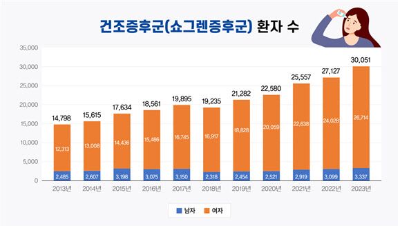 쇼그렌증후군은 주로 40~50대 여성에서 많이 발생하는데 국내에서는 여성이 남성보다 14.5배 더 많이 발생한다. 건강보험심사평가원의 보건 의료빅데이터 자료를 보면 쇼그렌증후군으로 병원을 찾은 경우가 2013년 14,798명 대비해 2023년은 30,051명으로 10년 새 2배가 증가했다. 2023년 기준, 여성 40대 이상 환자 수는 24,063명으로 전체 환자의 80%를 차지한다.