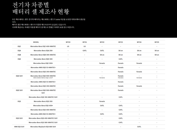한편 지난 13일 메르세데스-벤츠 코리아는 홈페이지에 전기차 차종별 배터리 셀 제조사를 공개했다. 논란이 된 점은 메르세데스-벤츠 최상위 모델에도 이번 화재 발생 원인으로 지목되고 있는 중국의 파라시스 배터리가 탑재됐다는 점이다.