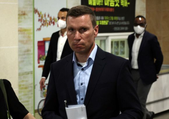 마티아스 바이틀 메르세데스-벤츠코리아 사장이 14일 오후 인천시 서구 청라동 한 교회에서 전기차 화재 피해 주민들과 간담회를 한 뒤 이동하고 있다. ⓒ 연합뉴스