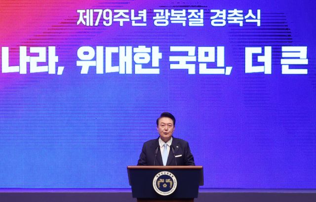 윤석열 대통령은 광복절인 15일 "분단 체제가 지속되는 한 우리의 광복은 미완성"이라며 "자유가 박탈된 동토의 왕국, 빈곤과 기아로 고통받는 북녘 땅으로 우리가 누리는 자유가 확장돼야 한다"고 했다.