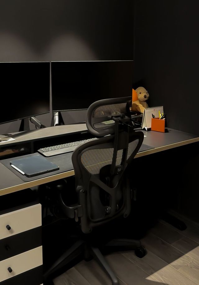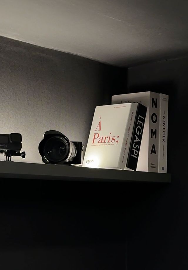 메인 공간의 화사한 핑크에 익숙해져 있었다면, 서재 문을 여는 순간 깜짝 놀랄 거예요. 세상 모든 색깔을 저편으로 날린 듯, 묵직한 블랙 인테리어가 기다리고 있거든요. 집에 들어서자마자 보이는 부엌 창문 틀과 수도꼭지가 검정이었던 건, 올블랙 서재의 예고편이었을지도 모르겠네요.