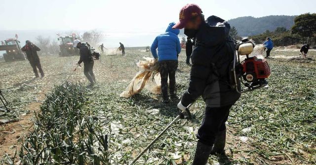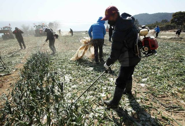 기사와 관련 없는 예초기 참고 사진. 양파밭 갈아엎는 농민들. 지난 2022년 2월 23일 오후 전남 고흥군 금산면 어전리 한 양파밭에서 열린 '양파 최저생산비(1kg 700원) 보장을 위한 2022년 전국양파생산자대회'에서 농민들이 예초기로 양파대를 자르고 있다. 사단법인 전국양파생산자협회는 이날 조생양파밭을 갈아엎고 농림축산식품부에 저장 양파 즉시 수매 등 수급 대책 마련을 요구했다. / 연합뉴스