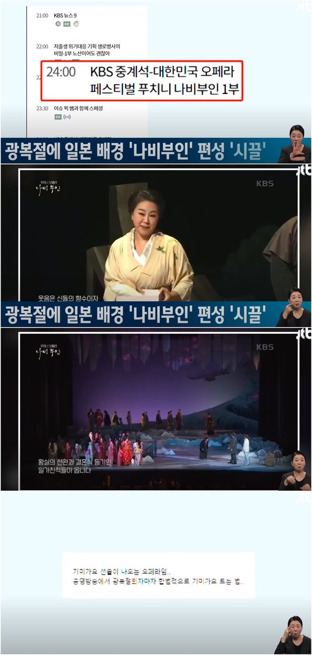 공영방송인 KBS 1TV가 광복절에 편성한 첫 번째 프로그램인 푸치니의 오페라 '나비부인' 일부 장면 / KBS 1TV, JTBC