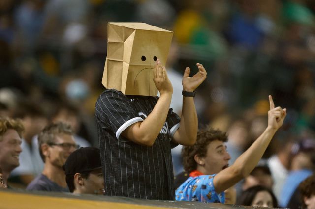 시카고 화이트삭스의 한 팬이 지난 7일(한국시간) 열린 오클랜드 애슬레틱스와 원정 경기에서 봉투를 덮어쓴채 응원하고 있다. AFP=연합뉴스