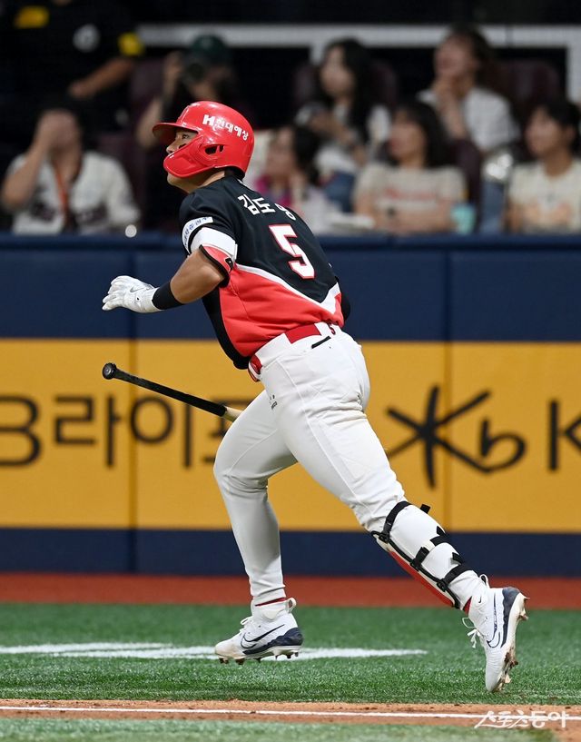 이날 김도영은 5회 1사 1루 상황에서 키움 선발투수 헤이수수에게 가운데 담장을 넘는 2점포를 터뜨렸다. 비거리 130m의 대형 홈런.
