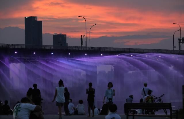 15日晚,首尔盘浦大桥下,大批市民在桥下乘凉。【图片提供 韩联社】